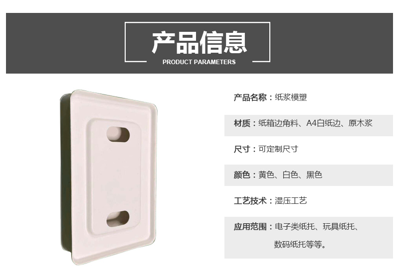 产品名称:电源盒湿压纸托 材质:纸箱边角料、A4白纸边、原木浆 尺寸:可定制尺寸 颜色:黄色、白色、黑色 工艺技术:湿压工艺 应用范围:电子类纸托、玩具纸托、数码纸托等等