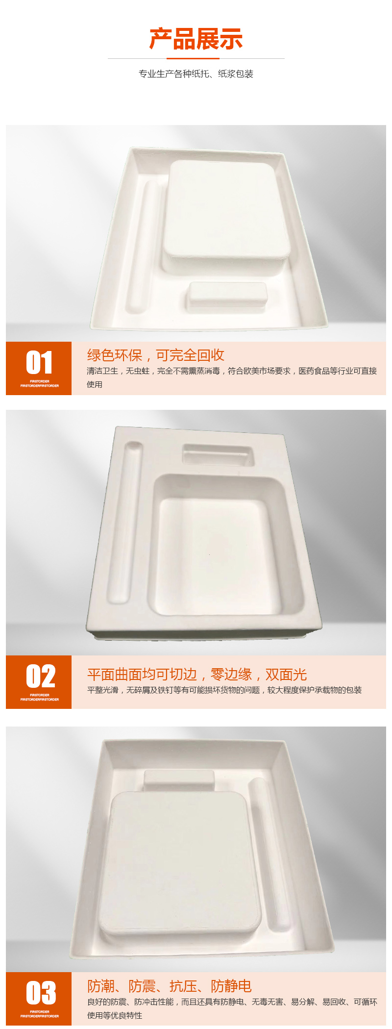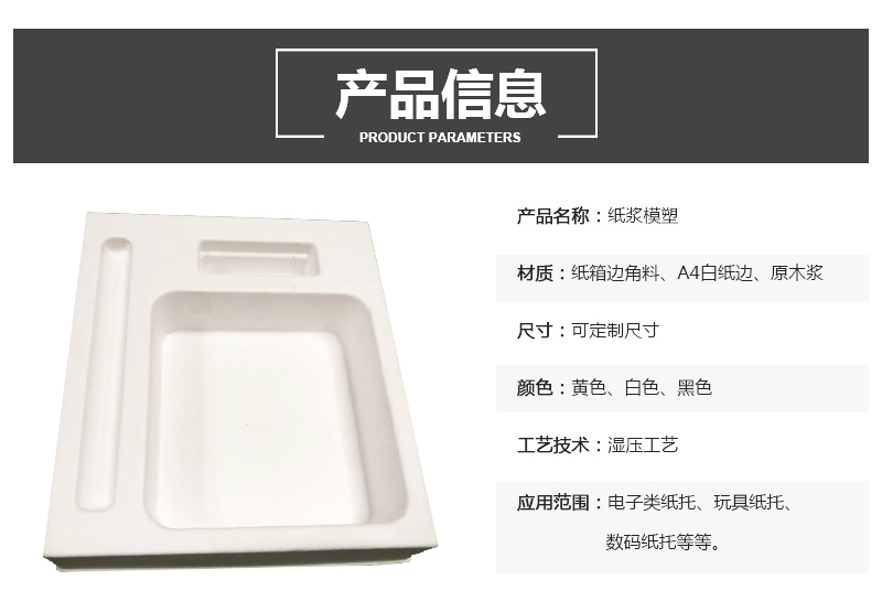 产品名称:高端电子屏湿压纸托 材质:纸箱边角料、A4白纸边、原木浆 尺寸:可定制尺寸 颜色:黄色、白色、黑色 工艺技术:湿压工艺 应用范围:电子类纸托、玩具纸托、数码纸托等等