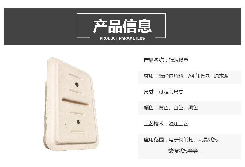 产品名称:护手霜湿压纸托 材质:纸箱边角料、A4白纸边、原木浆 尺寸:可定制尺寸 颜色:黄色、白色、黑色 工艺技术:湿压工艺 应用范围:电子类纸托、玩具纸托、数码纸托等等