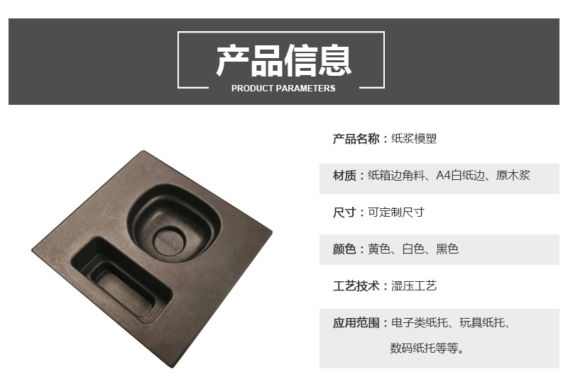 产品名称:蓝牙耳机湿压黑色纸托 材质:纸箱边角料、A4白纸边、原木浆 尺寸:可定制尺寸 颜色:黄色、白色、黑色 工艺技术:湿压工艺 应用范围:电子类纸托、玩具纸托、数码纸托等等