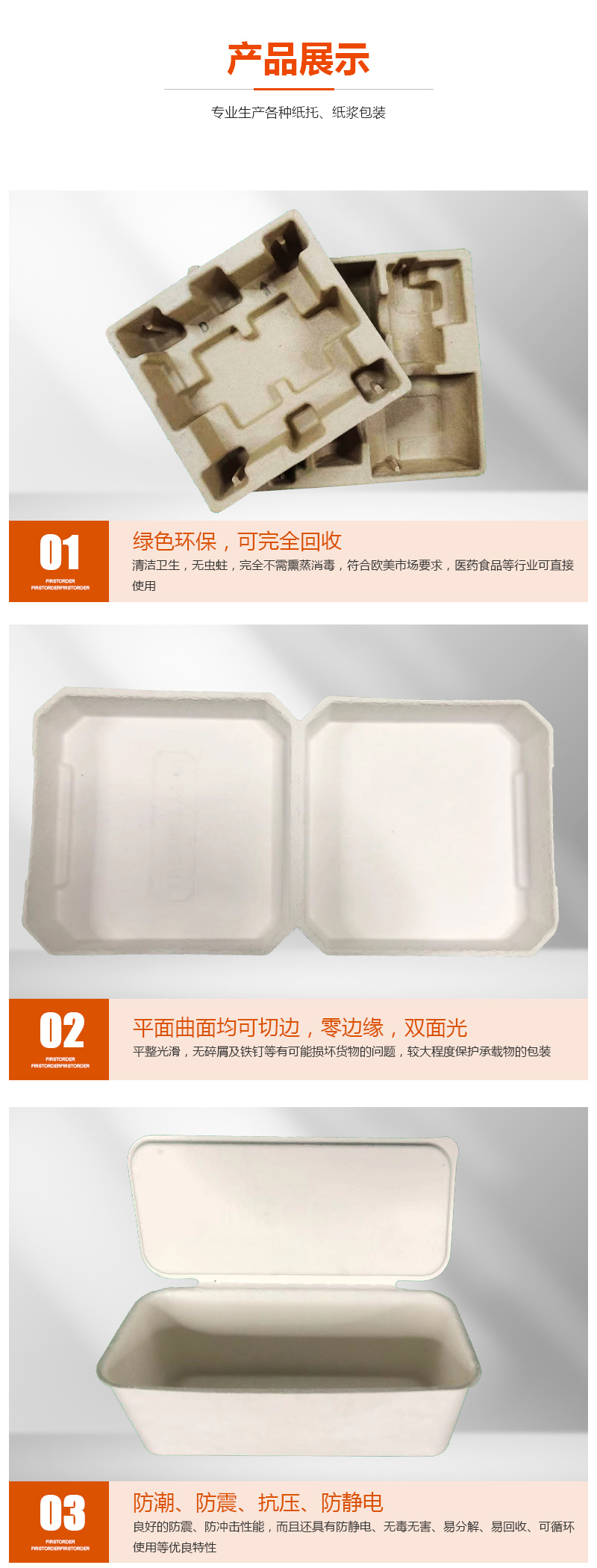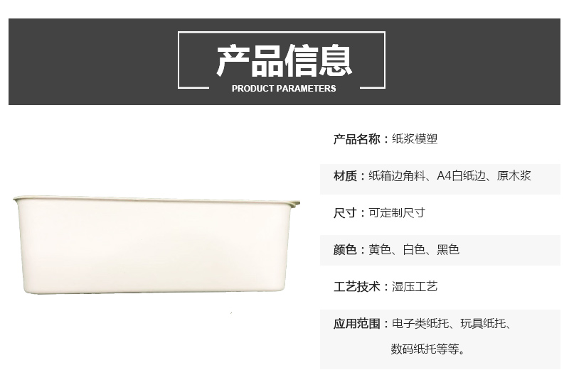 产品名称:眼镜盒湿压纸托 材质:纸箱边角料、A4白纸边、原木浆 尺寸:可定制尺寸 颜色:黄色、白色、黑色 工艺技术:湿压工艺 应用范围:电子类纸托、玩具纸托、数码纸托等等