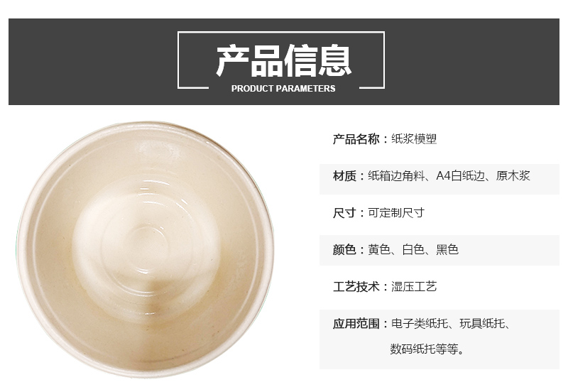 产品名称:自热锅湿压纸托 材质:纸箱边角料、A4白纸边、原木浆 尺寸:可定制尺寸 颜色:黄色、白色、黑色 工艺技术:湿压工艺 应用范围:电子类纸托、玩具纸托、数码纸托等等