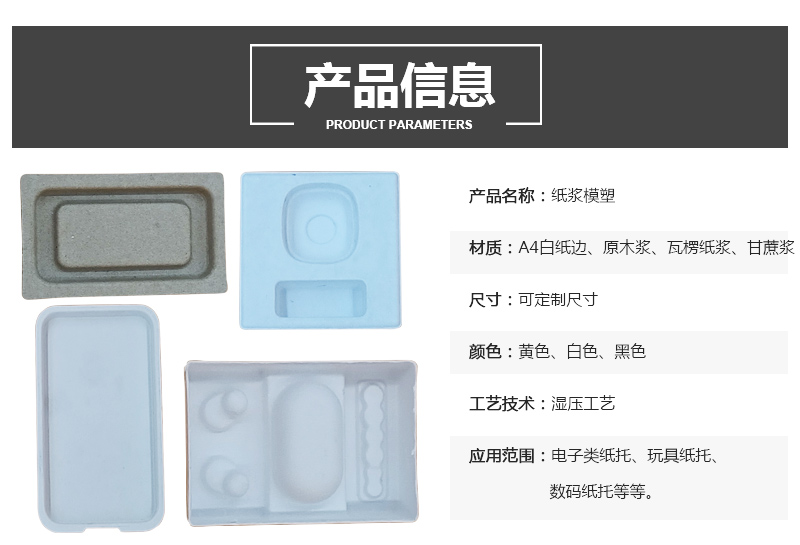 产品名称:手机壳干压纸托 材质:A4白纸边、原木浆、瓦楞纸浆、甘蔗浆 尺寸:可定制尺寸 颜色:黄色、白色、黑色 工艺技术:干压工艺 应用范围:电子类纸托、玩具纸托、数码纸托等等