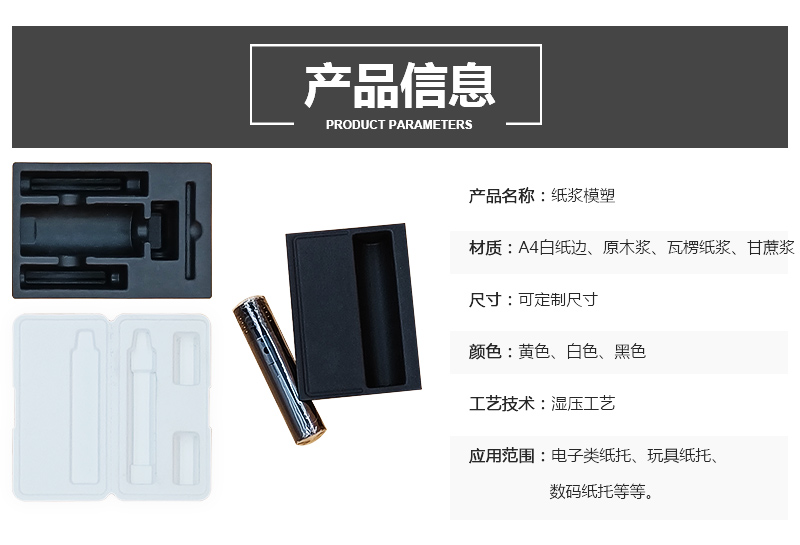 产品名称:电子烟黑色湿压纸托 材质:A4白纸边、原木浆、瓦楞纸浆、甘蔗浆 尺寸:可定制尺寸 颜色:黄色、白色、黑色 工艺技术:湿压工艺 应用范围:电子类纸托、玩具纸托、数码纸托等等