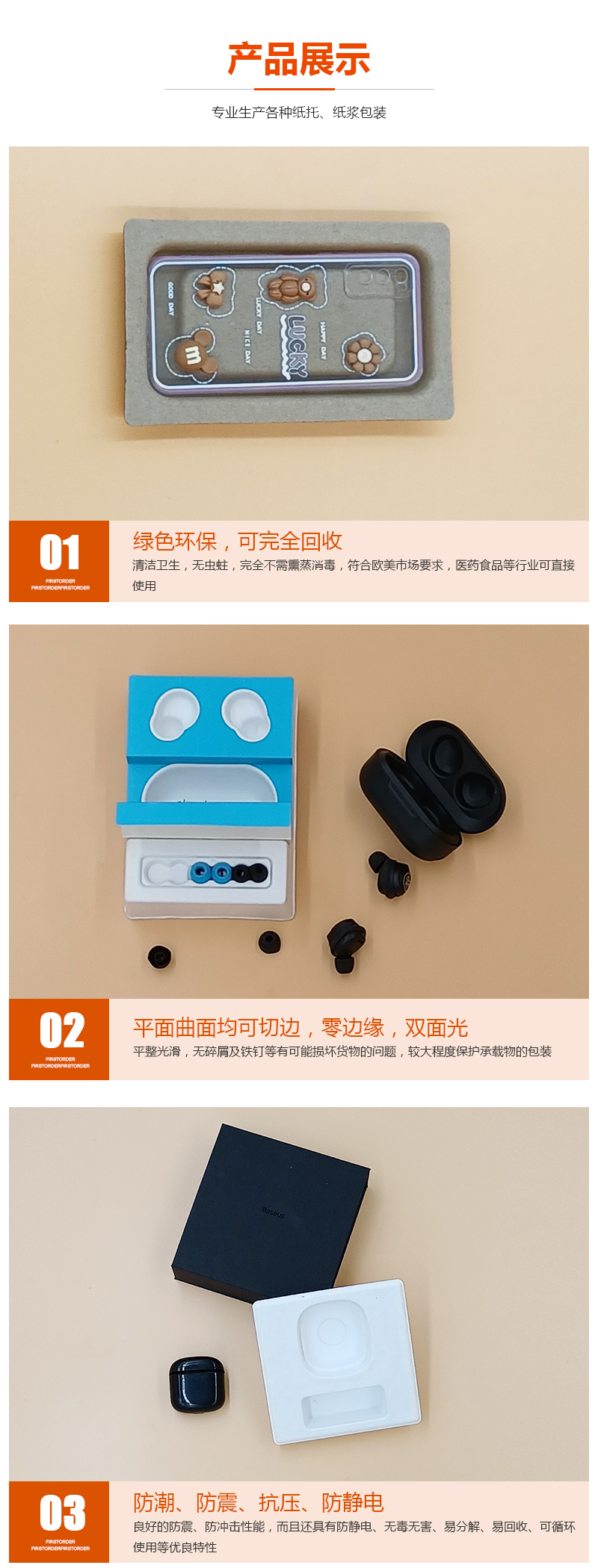 产品名称:耳机湿压纸托 材质:A4白纸边、原木浆、瓦楞纸浆、甘蔗浆 尺寸:可定制尺寸 颜色:黄色、白色、黑色 工艺技术:湿压工艺 应用范围:电子类纸托、玩具纸托、数码纸托等等