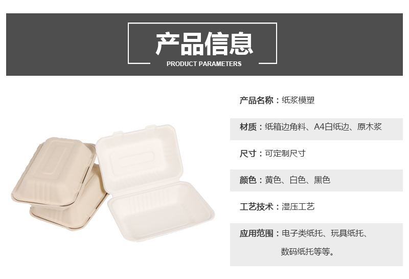 产品名称:餐盒湿压纸托 材质:纸箱边角料、A4白纸边、原木浆 尺寸:可定制尺寸 颜色:黄色、白色、黑色 工艺技术:湿压工艺 应用范围:电子类纸托、玩具纸托、数码纸托等等