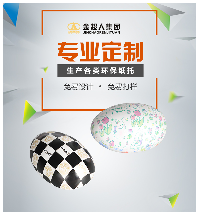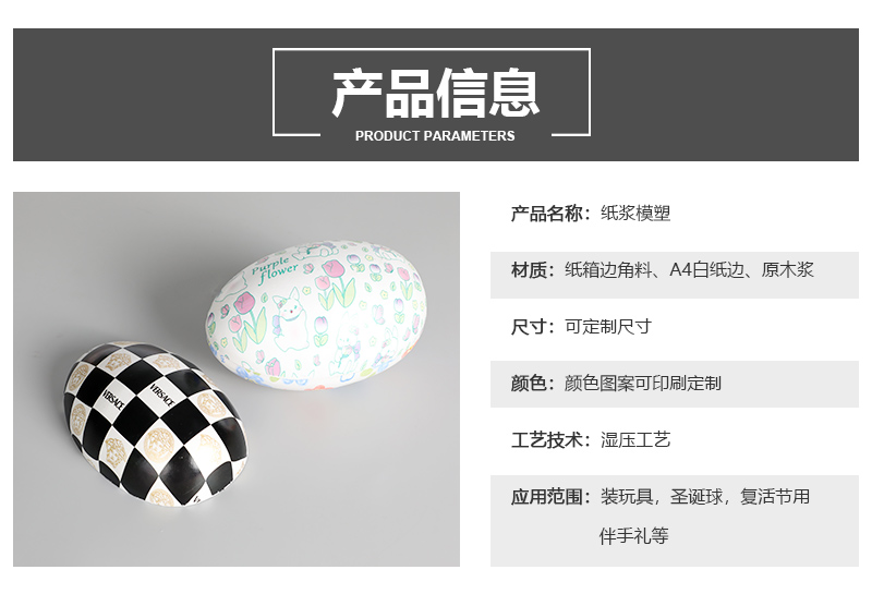 产品名称:纸浆模塑 材质: 纸箱边角料、A4白纸边、原木浆 尺寸:可定制尺寸 颜色:颜色图案可定制印刷 工艺技术:湿压工艺 应用范围:装玩具,圣诞球,复活节用伴手礼等等
